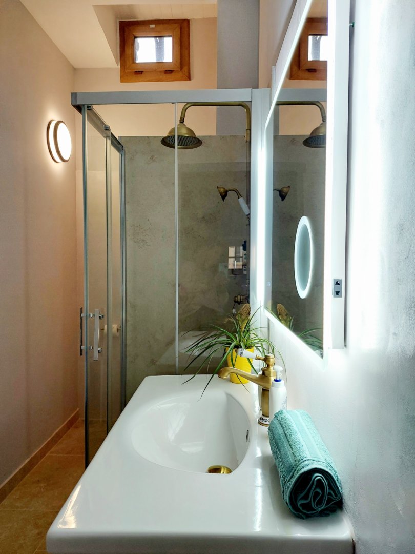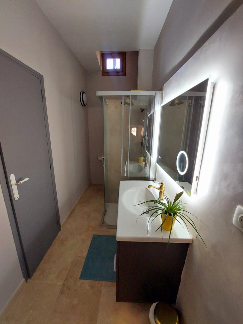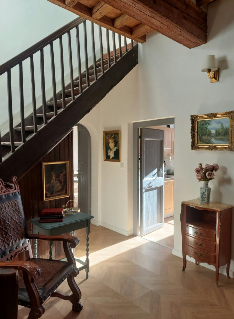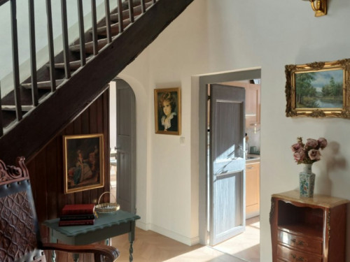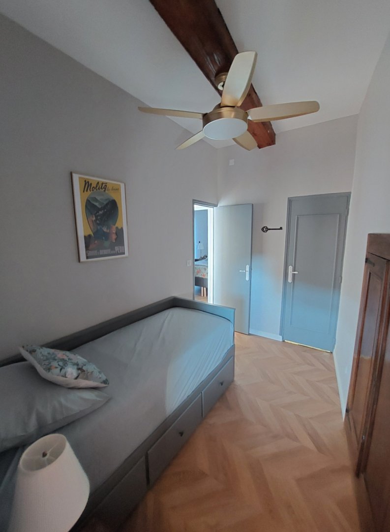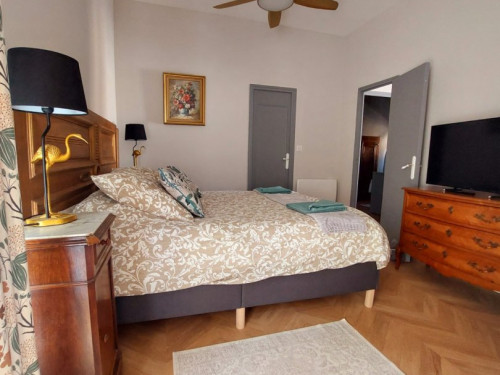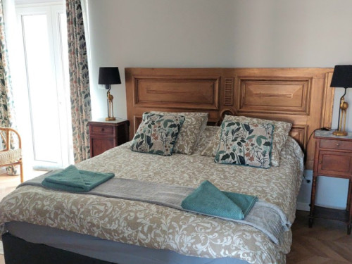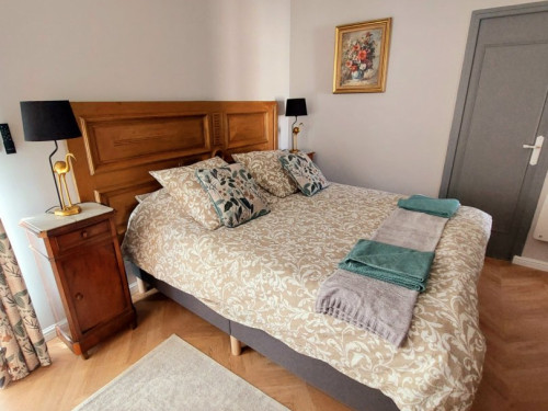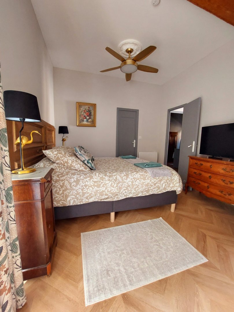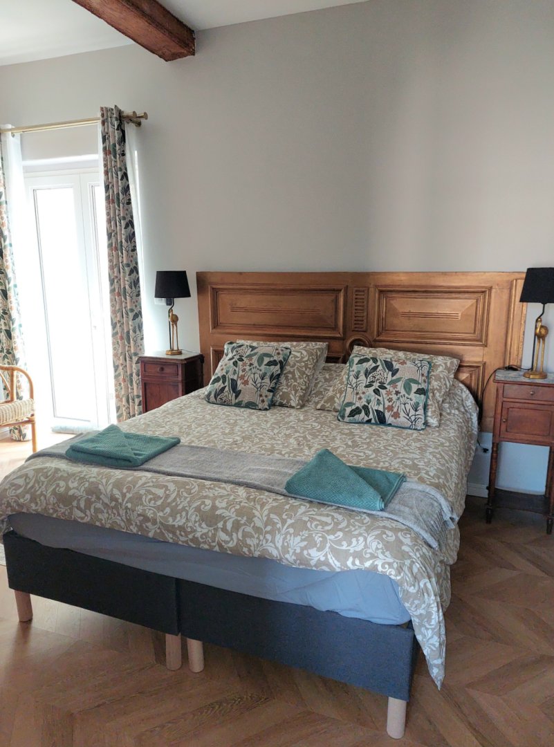 Perché au premier étage, l'appartement vous accueille avec une terrasse privée, face à un jardin serein qui s'étend derrière le château, pour des moments de détente en plein air. La première chambre, avec son lit double convertible en deux lits jumeaux, se transforme en havre de paix pour tous, tandis que la deuxième chambre, avec son lit simple et son placard, offre un cocon cosy. a grande salle de bain, avec sa douche et ses produits d'hygiène écologiques, vous promet une parenthèse rafraîchissante, accompagnée d'un sèche-cheveux pour parfaire votre confort.