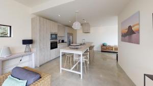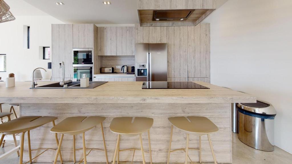The spacious villa features 4 bedrooms, 4 bathrooms, bed linen, towels, a TV, a fully equipped kitchen, and a terrace with sea views.
