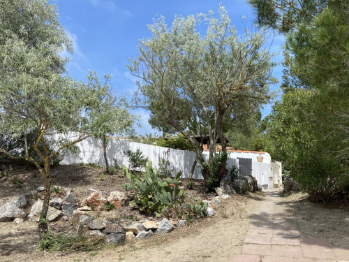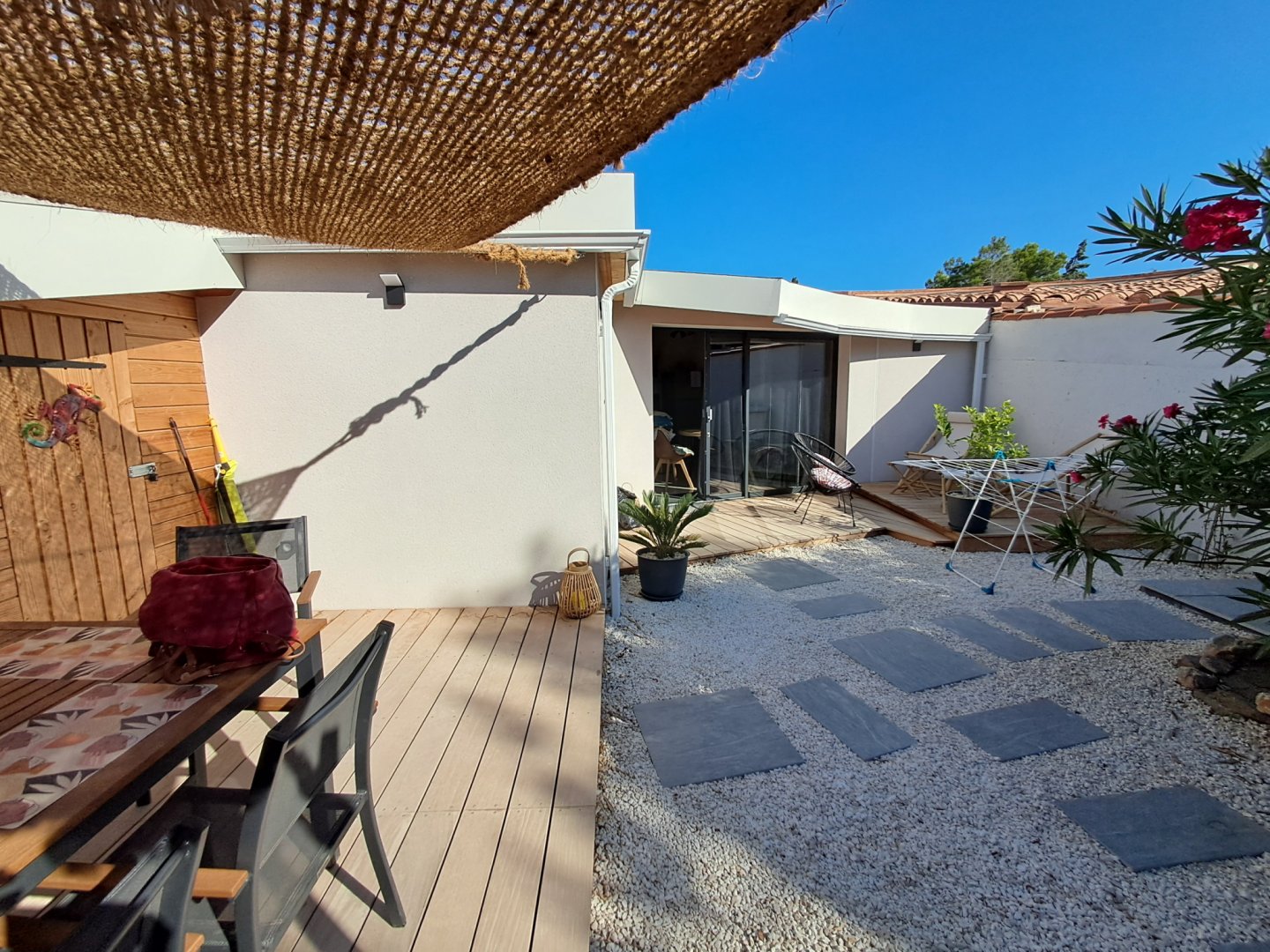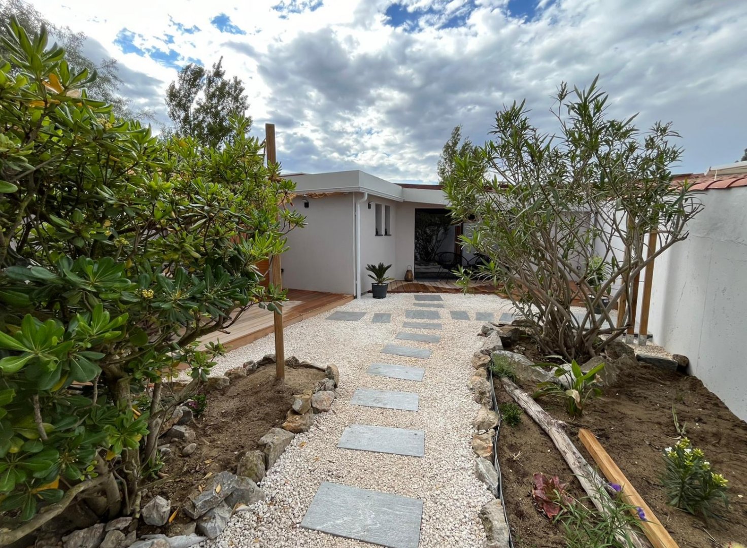 La villa, de plain-pied, très lumineuse et baignée de soleil, est ouverte sur une belle terrasse en bois et un jardin paysagé.