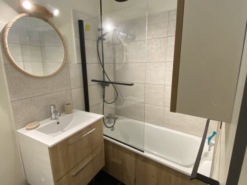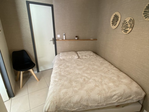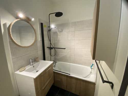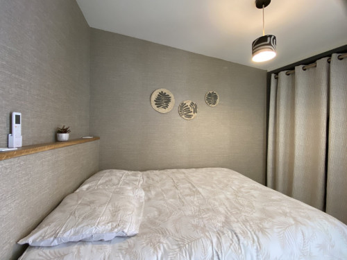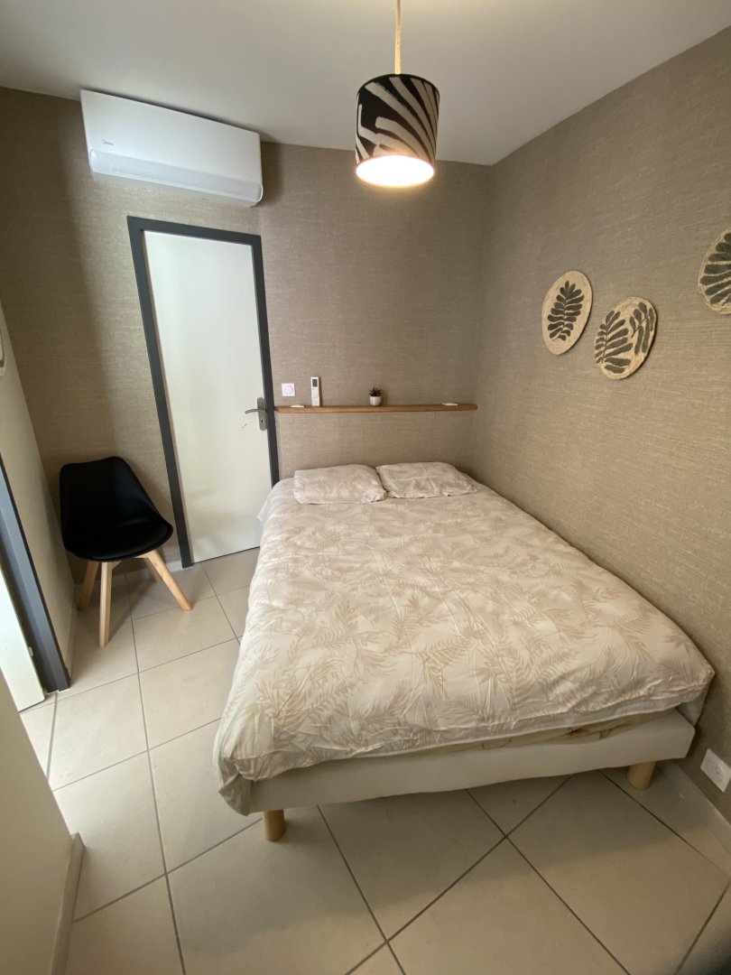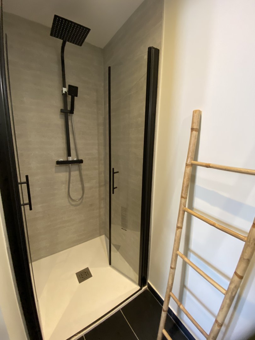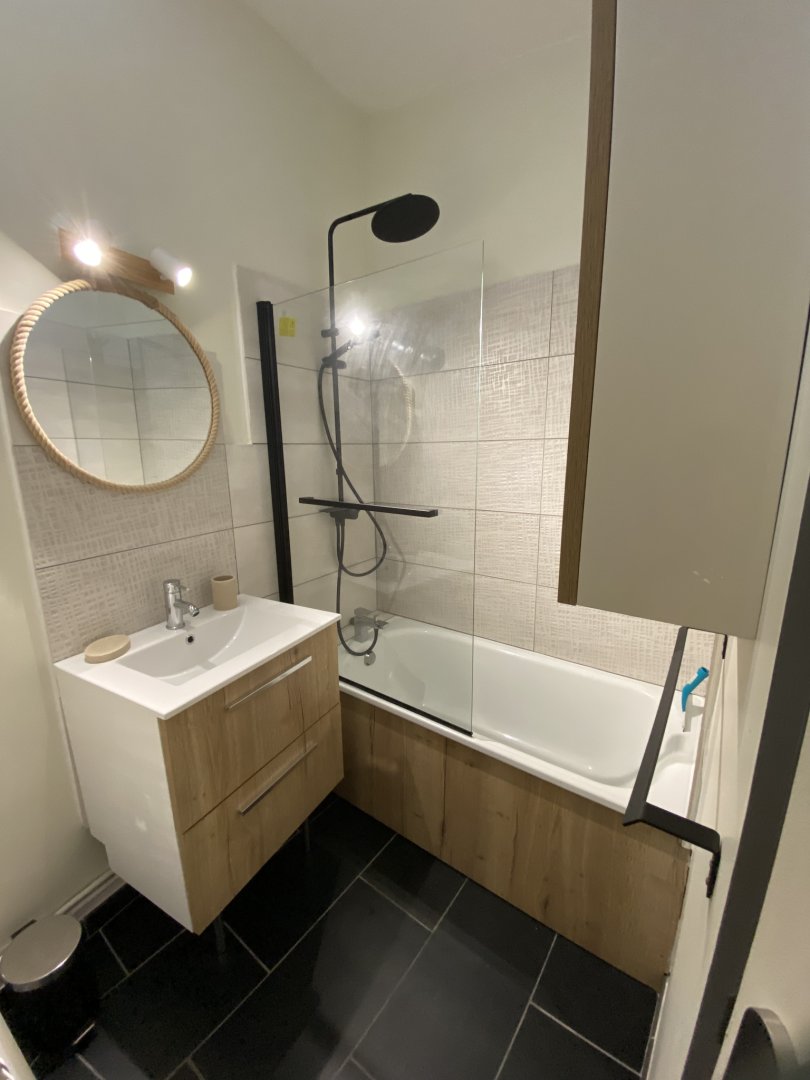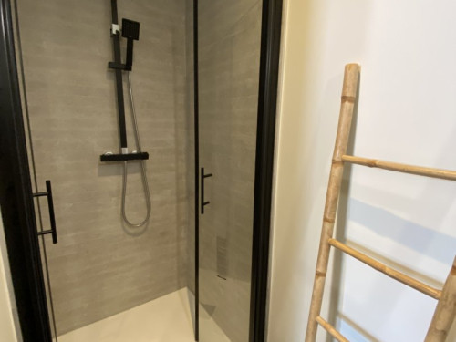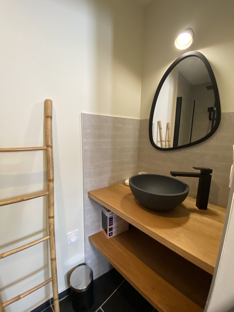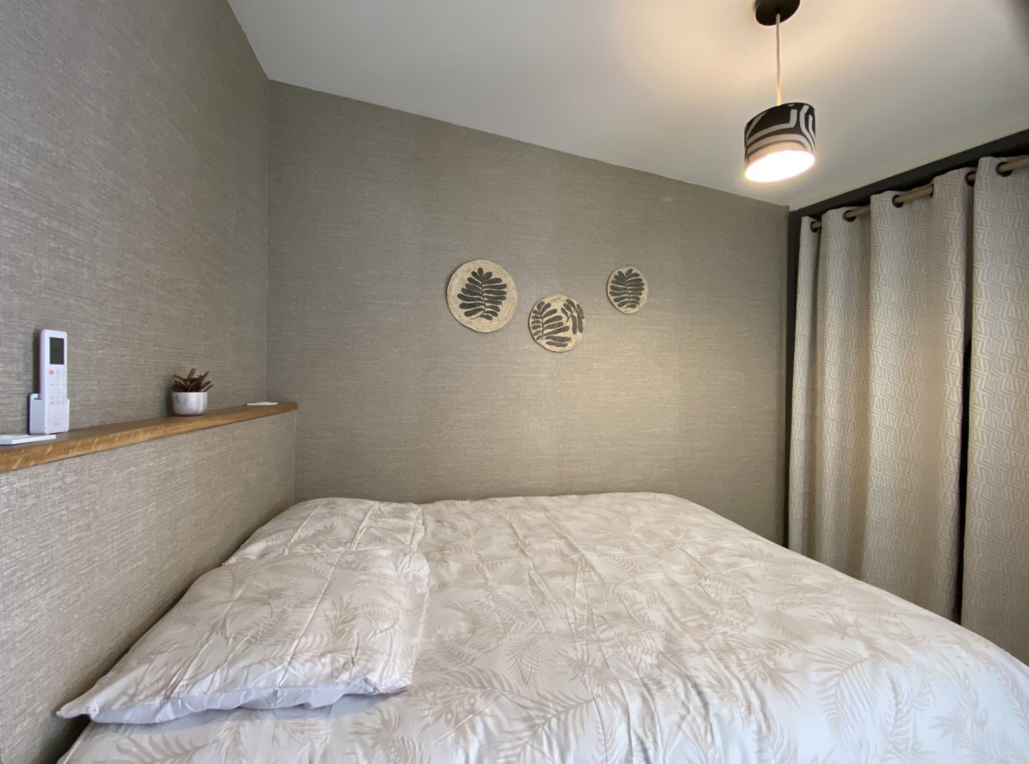 De part et d'autre de l'espace de vie, vous accédez à deux chambres séparées disposant chacune de leur salle de bains, l'une avec baignoire et l'autre avec douche
