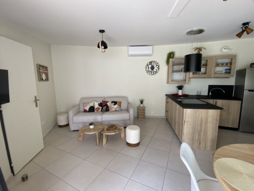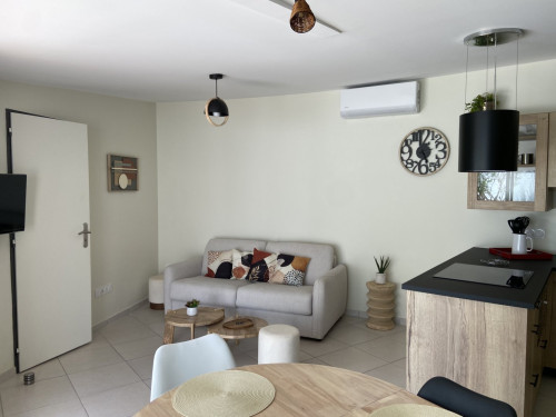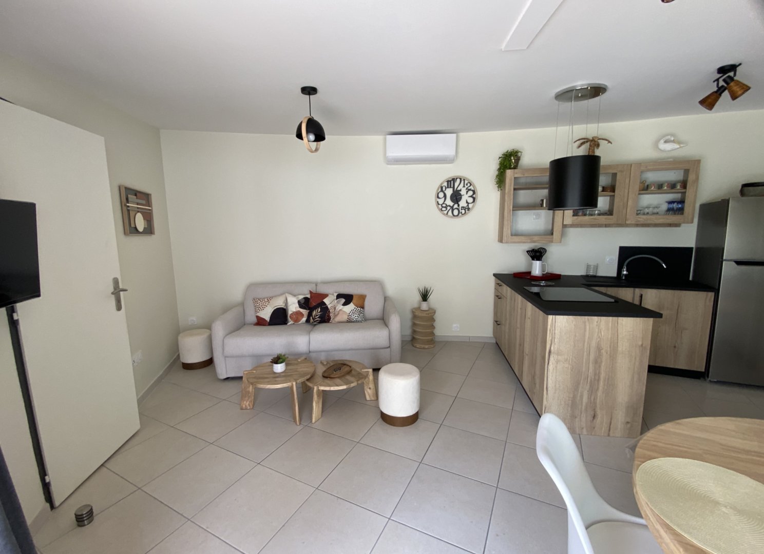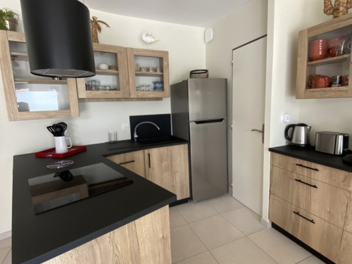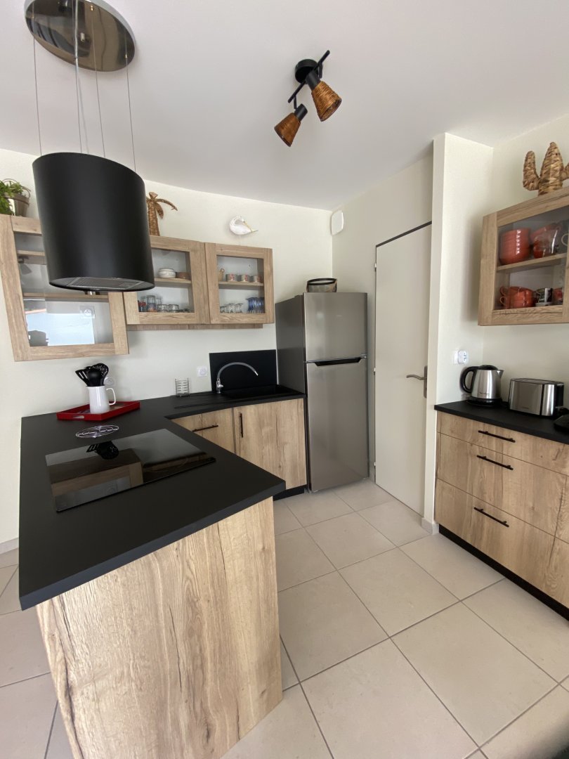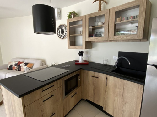 La pièce de vie comprend une cuisine entièrement équipée avec four micro-ondes grill combiné intégré, plaque vitrocéramique, hotte aspirante, lave-vaisselle.