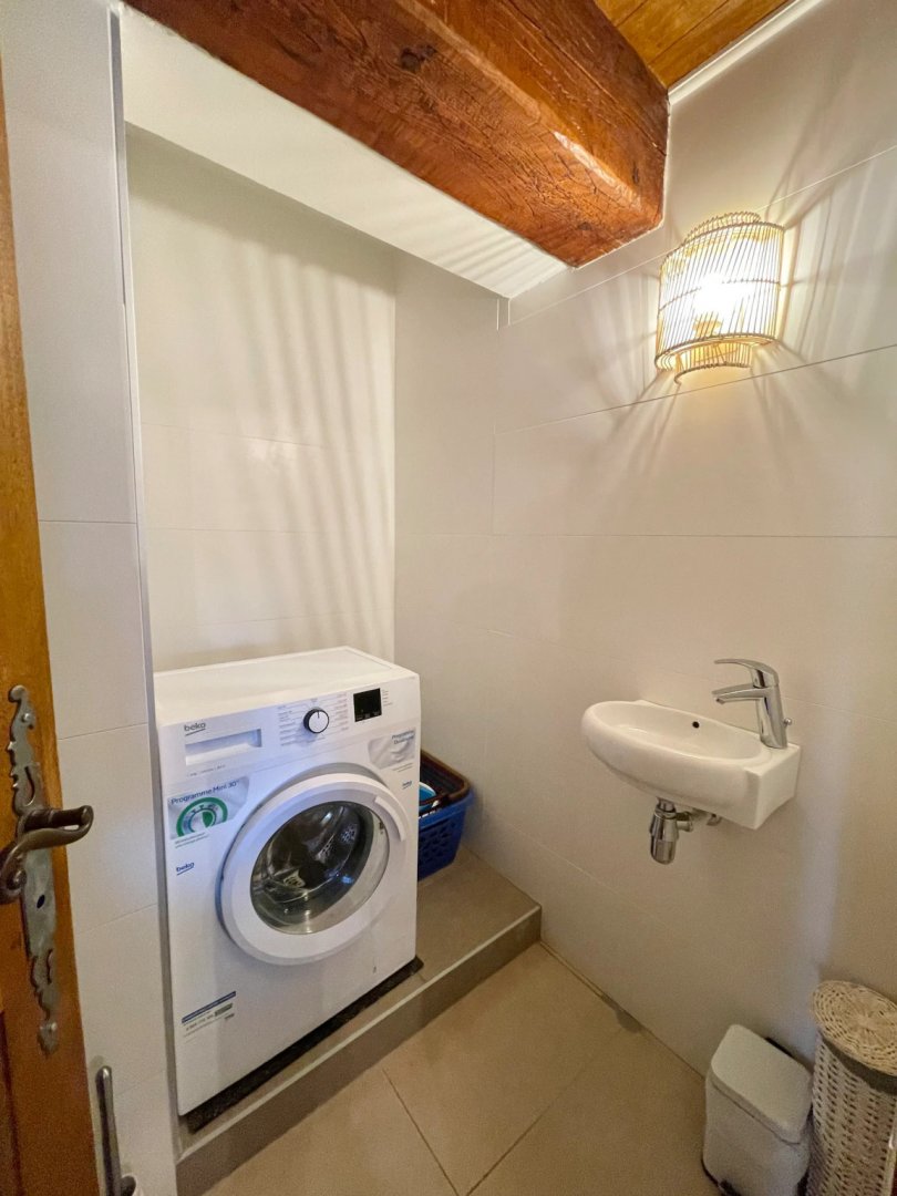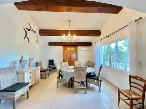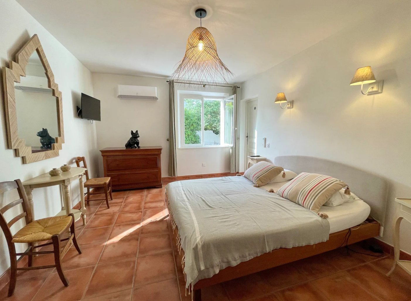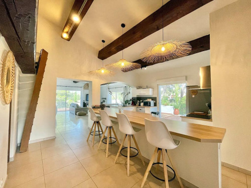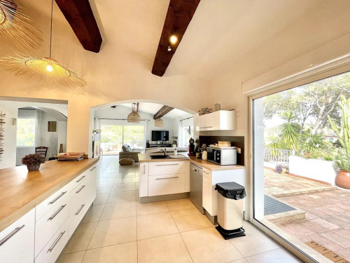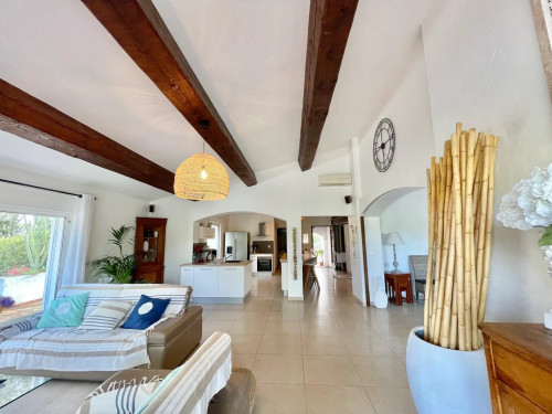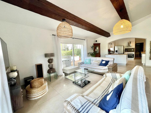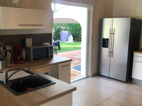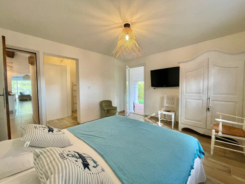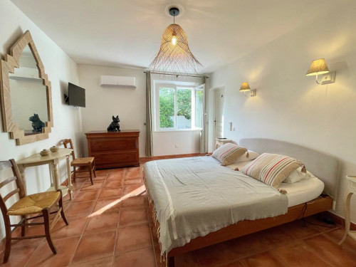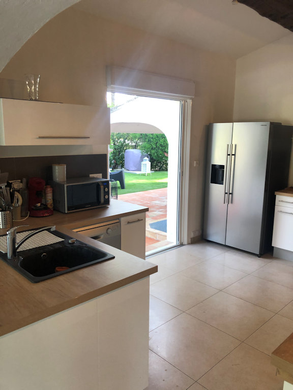 La villa est équipée d'une cuisine plaque induction, frigo-américain, four, micro-ondes, machine à laver, 3 chambres avec lit 160 avec leur salle de bain privative et TV, 3 WC, terrasse, salon de jardin, 4 bains de soleil.