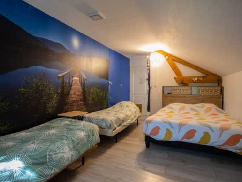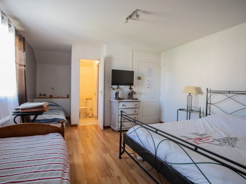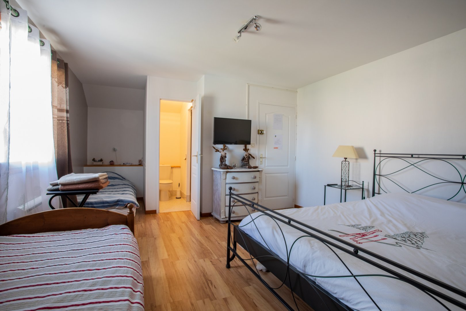 chambre "pleine lune" : 1 grand lit, deux lits simples, TV, salle d'eau - toilettes