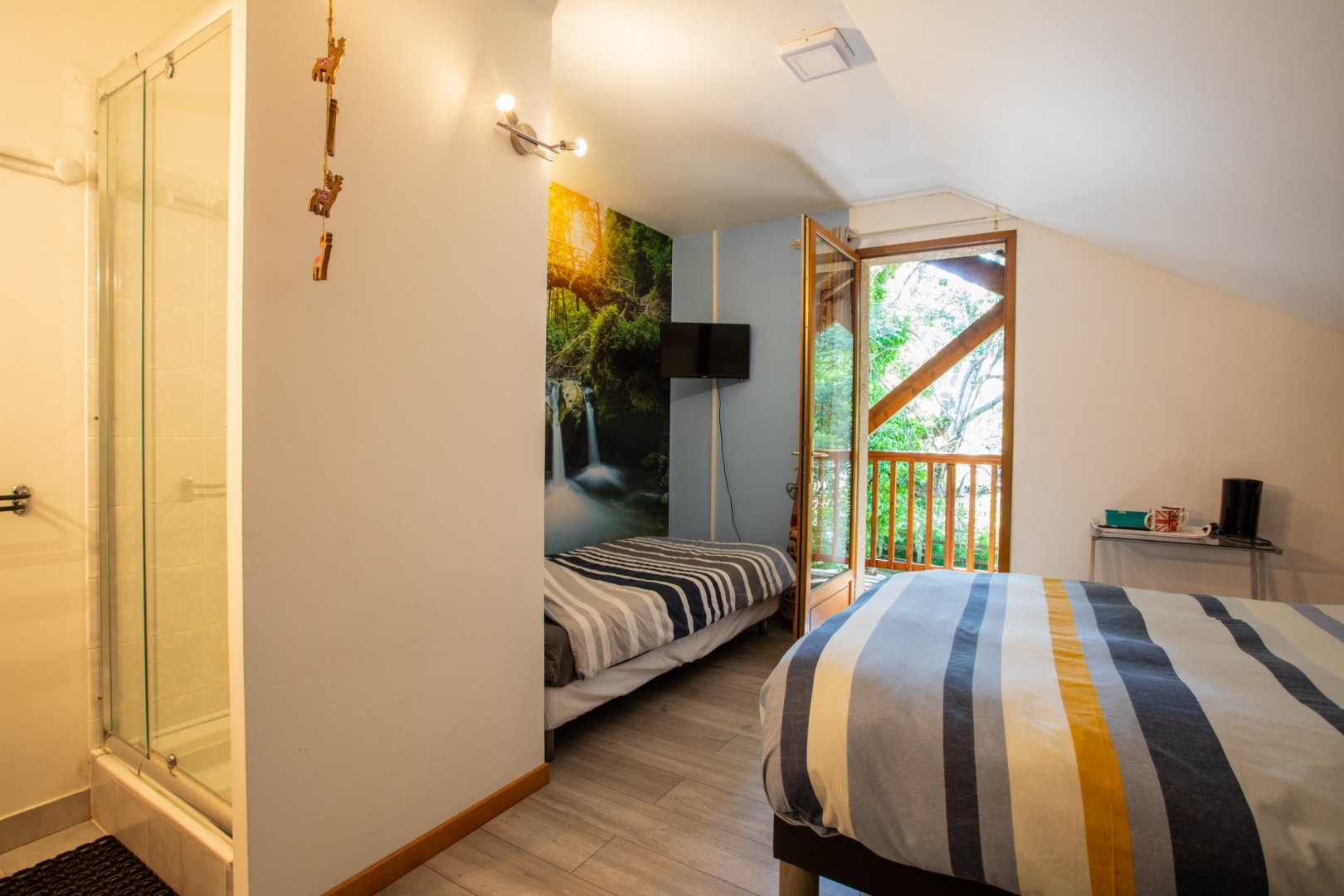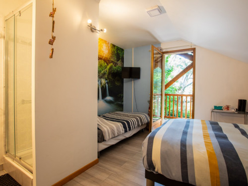chambre "reflets sur l'eau" : un grand lit, deux lits simples, balcon, TV, salle d'eau - toilettes sur le palier