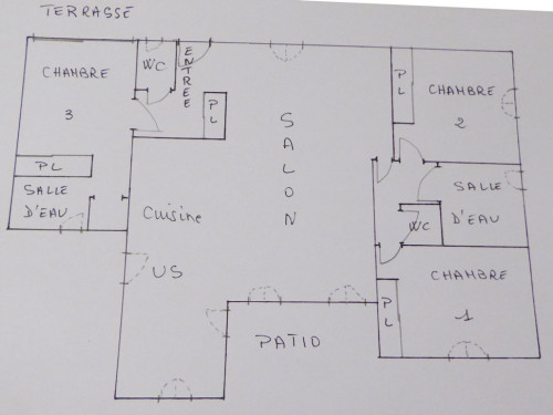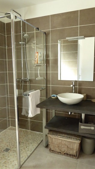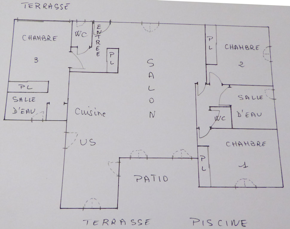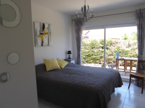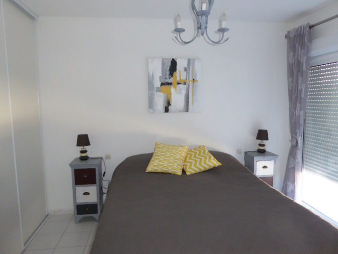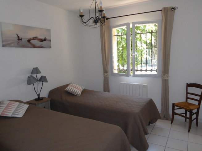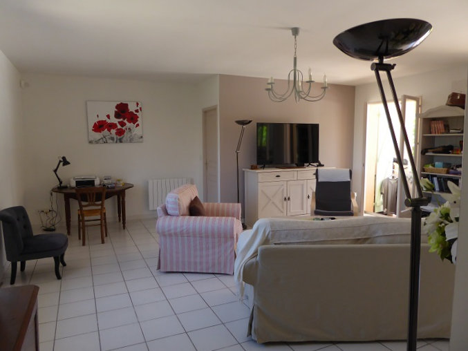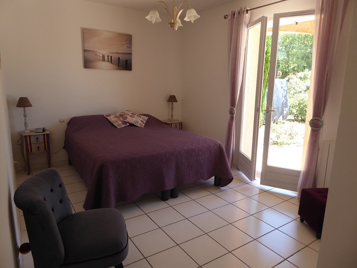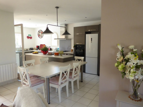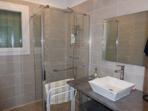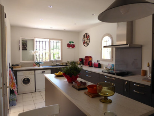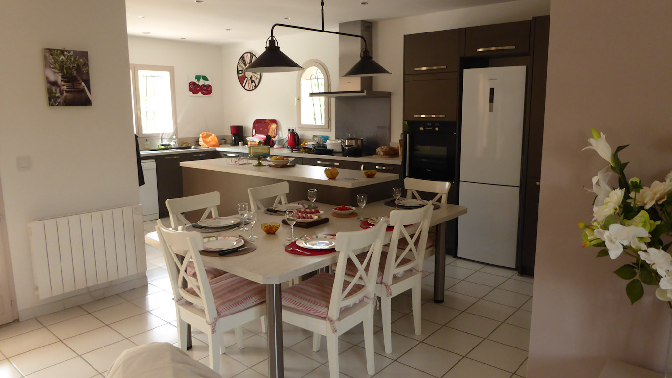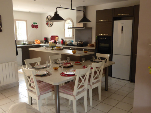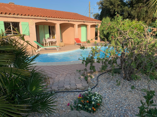 De plain-pied, elle comprend un grand salon climatisé avec cuisine américaine ouverts sur une grande terrasse ombragée et salon de jardin, 3 chambres climatisées dont 2 avec 1 lit de 2 personnes (160x200) et 1 avec 2 lits 1 personne (90x200). 2 salles d'eau avec douche italienne et 2 WC indépendants.
