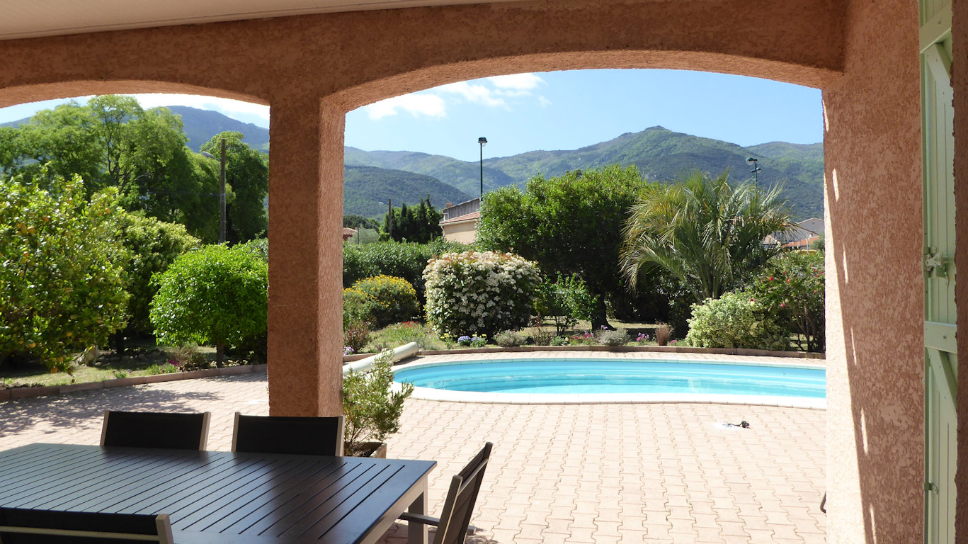 Agréable villa sur un jardin paysager clos de 1 100 m² avec piscine sécurisée par une bâche à barres, terrasse avec barbecue et vue sur la chaine des Albères et le Néoulous.