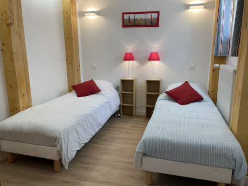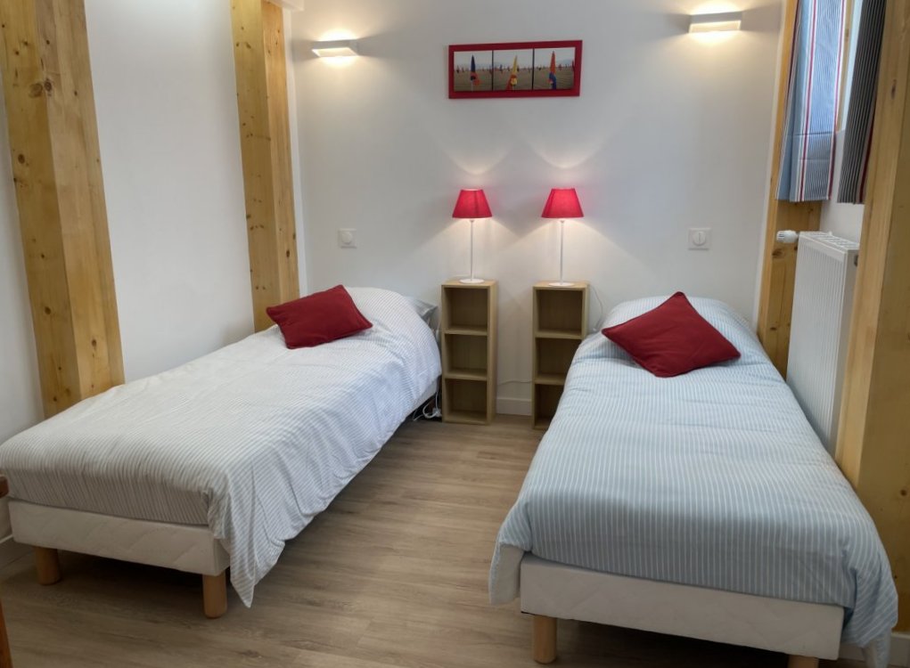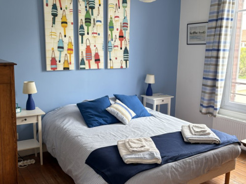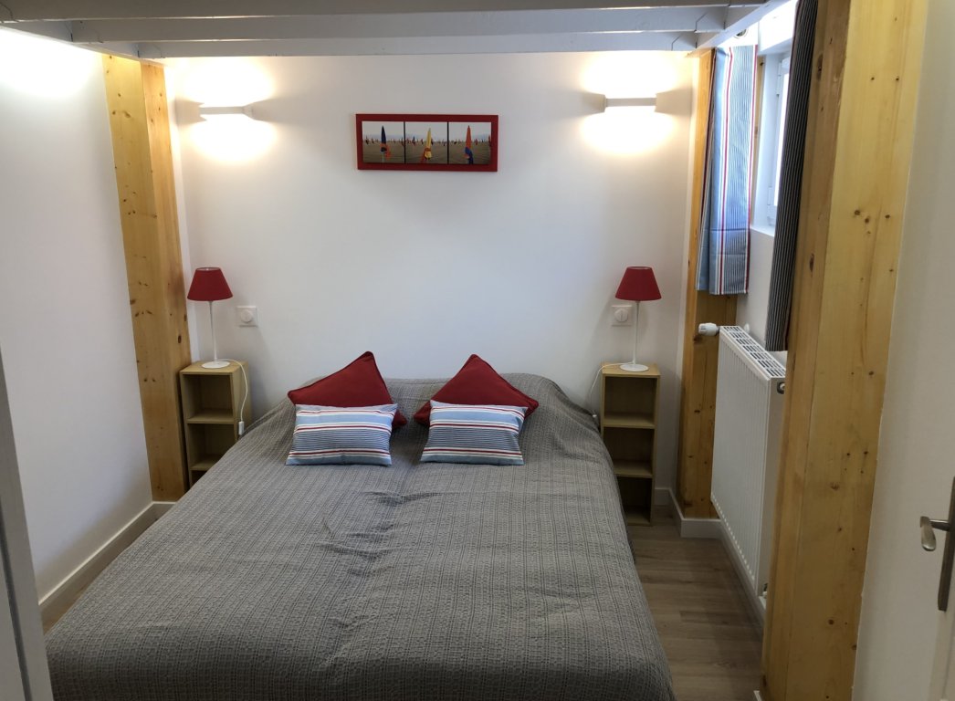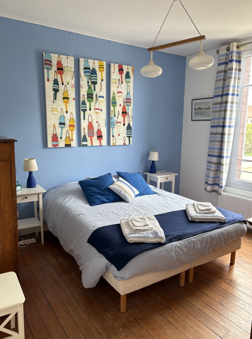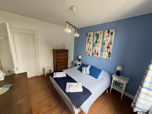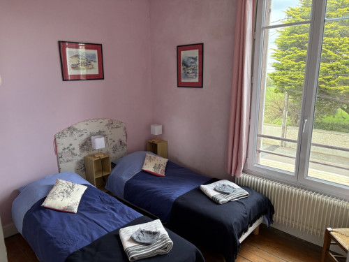 Au 1er étage : 1 grande chambre avec un lit double (160x200) vue sur mer ; 1 chambre avec un lit simple (90x190) vue sur mer et une petite salle de douche attenante ; 1 chambre avec 2 lits simples (2x 80x190) pouvant être accrochés pour faire un lit double ; une salle de bain avec baignoire et des toilettes indépendantes.