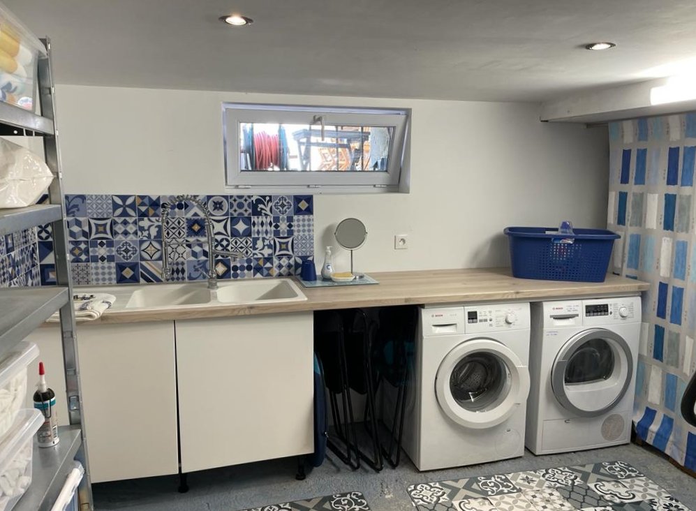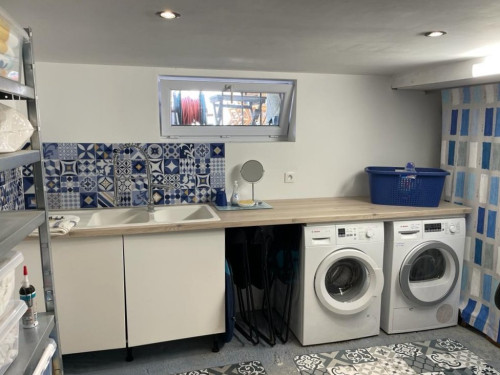 A l’entresol, un pallier avec petit bureau dessert une petite chambre double avec lit double pouvant être séparé en 2 lits simples (140x190 ou 2x 70x190) : une buanderie avec lave-linge, sèche-linge, grand évier, étendoir, planche et fer à repasser.