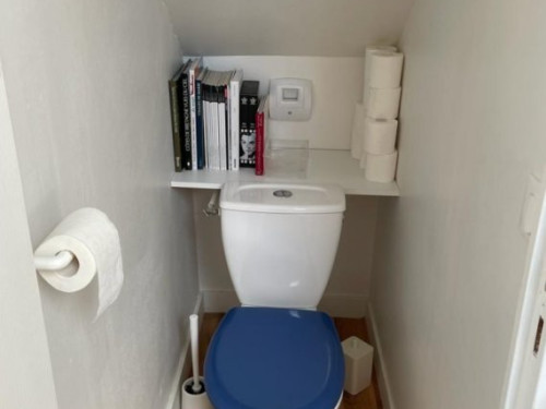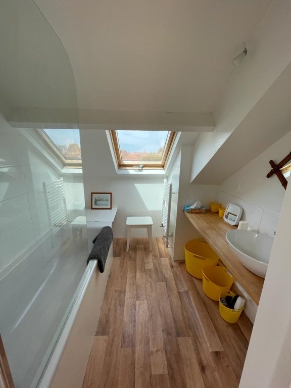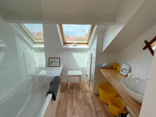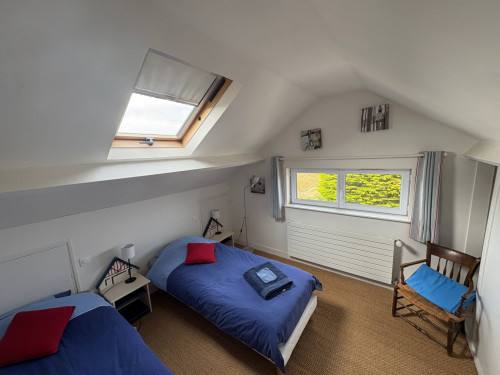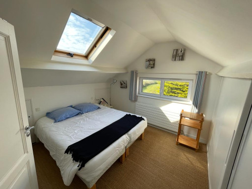 Au 2nd étage sous les toits : un grand pallier avec bureau dessert : 1 chambre double vue sur mer avec un lit double pouvant être séparé en lits simples (160x200 ou 2x 80x200) ; 1 salle de bain avec baignoire ; des toilettes indépendantes.