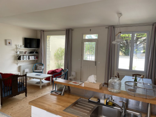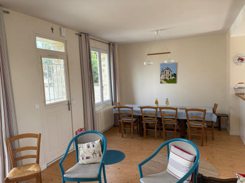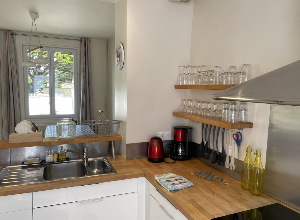 Salon cosy avec grand écran et baie vitrée donnant sur le jardin. Salle-à-manger avec grande table familiale de 10 couverts. Cuisine semi-ouverte totalement équipée : lave-vaisselle, plaques à induction, four, four à micro-ondes, machine à café Nespresso, bouilloire, grille-pain… il y a aussi dans l’entrée, une penderie et des toilettes avec lavabo.
