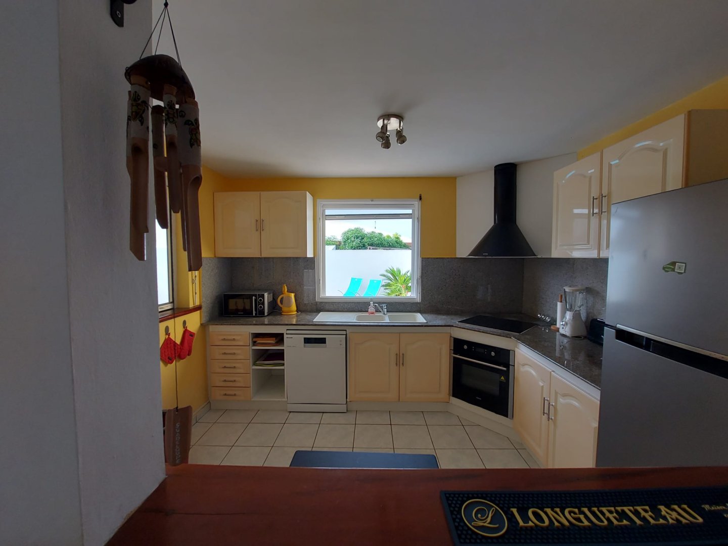 Cuisine ouverte sur le salon, et passe plats vers la terrasse.