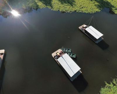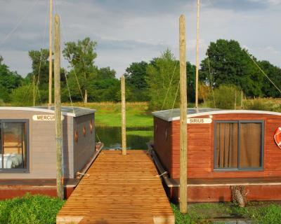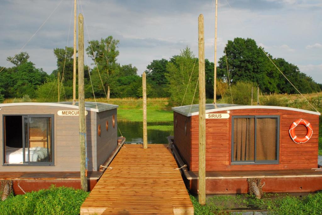 Les bateaux sont situés sur un lac de 3 hectares et sont soit ancrés au milieu de l'eau (accessible par un bateau à rames) ou amarrés au quai (accessible à pied). Chaque hébergement dispose d'une terrasse meublée, d'un coin salon confortable, d'une kitchenette et d'une salle de bains privative. Tous les bateaux offrent une vue imprenable sur l'eau.