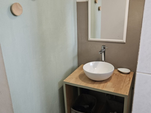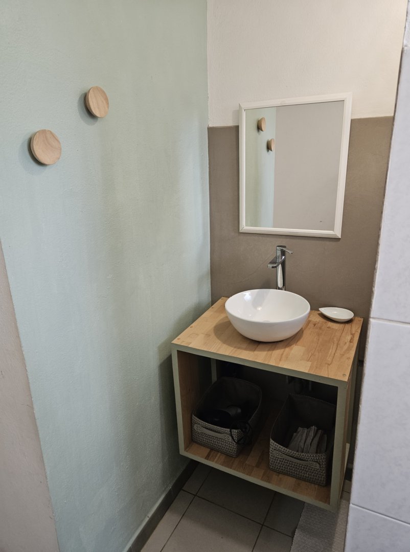 La salle de bains est équipée d'une douche à l'italienne en béton ciré.