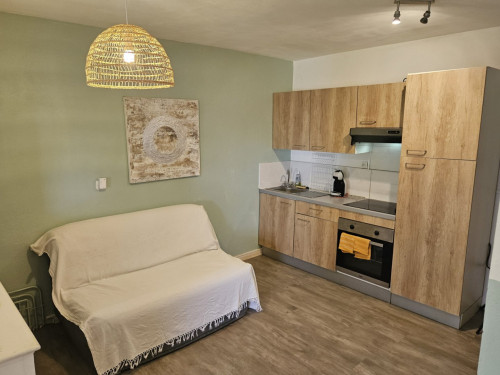 La cuisine est équipée d'un four, d'une plaque de cuisson 4 feux, d'une hotte et d'un frigo