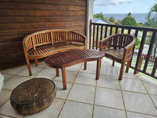 La varangue est équipée d'une table pour 4 personnes et d'un salon en teck.